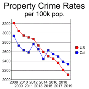 Proposition 47 was enacted late in 2014. Since 2014, property crime has dropped 18.7% in the country as a whole but only 4.5% in California. Supporters of this and later measures can say that enactment was followed by a decrease, not an increase, in crime. However, that simplistic answer glosses over the fact that this modest decrease occurred at a time when rates were plunging nationally. Thus the entirely possible criminogenic effect of these policies is masked, to some extent, by the national trend.